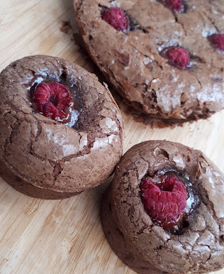*Y sigo este mismo método cuando hago la versión con frambuesas. Justo cuando lleva el brownie 10 minutos de horneado le pongo las frambuesas encima y sigo horneando el tiempo restante. Así consigo que la fruta quede entera, pero que suelto parte de sus jugos, por lo tanto, una vez está terminado y toca disfrutar de él se nota en cada bocado parte de la frambuesa que parece pura mermelada y no es más que la pieza entera de fruta.
