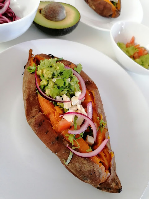 3. Una vez esté asada la batata, solo tienes que hacerle un corte longitudinal, tal y como se aprecia en la foto y rellenarla con la lechuga bien picada, los cuadraditos de tomate, el aguacate con sal, el queso semi bien desmigado y la cebolla. Si te apetece puedes coronar el asunto con cilantro recién picado. Y listo.