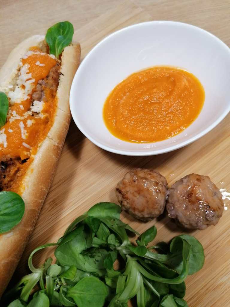 5. Rellena el pan con las albóndigas y la salsa, ralla un poco de queso ahumado ( o el que más te guste) por encima. Ponlo de nuevo al horno a gratinar unos segundos.