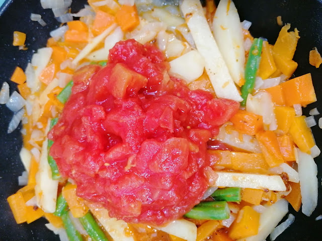 4. Una vez el alcohol del vino esté evaporado, le pones la pasta que obtuviste al mezclar el ajo junto a las especias y el aceite. Lo remueves todo bien y le incorporas la lata de tomates entera.