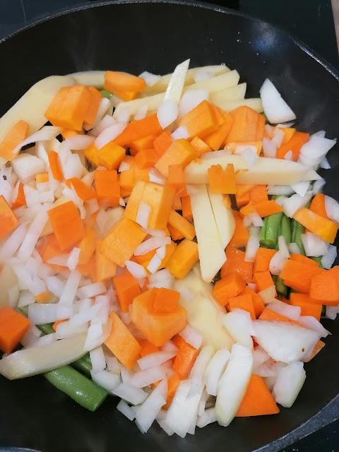 1. Corta la cebolla, la zanahoria, la calabaza y las habichuelas en brunoise (en cuadrados pequeños) y las papas córtalas como para hacerlas fritas, pero intenta que se queden finas, así se harán antes.Y pon todo a pochar en una sartén con un poco de aceite de oliva virgen extra a fuego medio.
