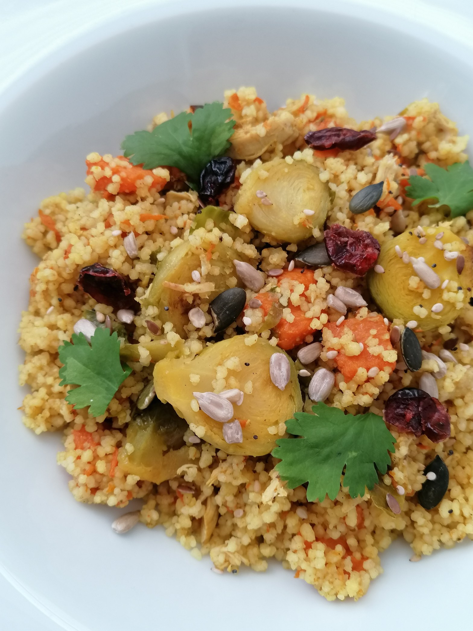 🟡Couscous de pollo con coles de Bruselas y arándanos secos 🟡