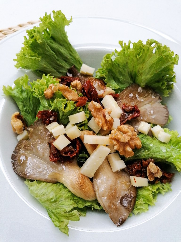 ☑️Colocar la lechuga, el tomate seco cortado en tiras pequeñas, el queso cortado en cuadraditos y las nueces en el plato. Poner por encima las setas acabadas de hacer.