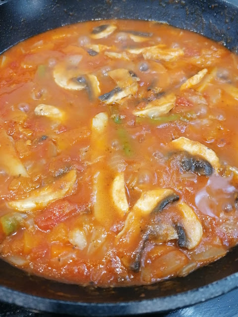 5. Pones la sartén a fuego medio-bajo y dejas todo cocinándose a fuego medio-bajo durante al menos 10 minutos. Pasado este tiempo, le añades los champiñones laminados por encima.