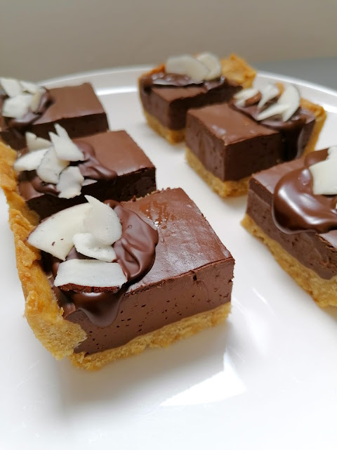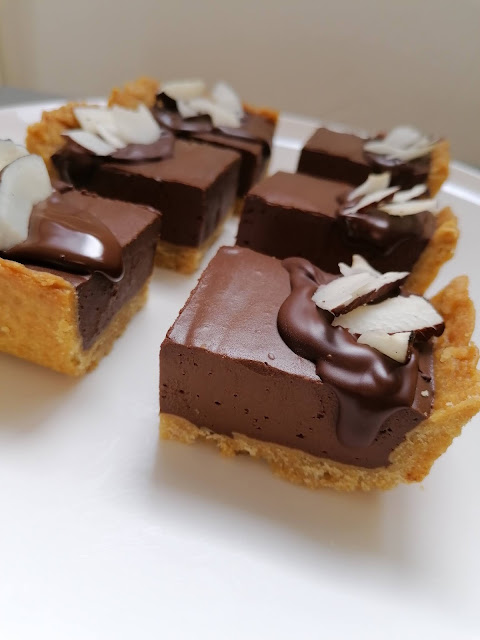 El chocolate lo meto en trocitos en una taza en el micro entre 30 y 40 segundos y luego lo remuevo bien y espero a que atempere para ponerlo por encima de la tartaleta. Y el coco lo compro tal cual en el Mercado de Vegueta, Gran Canaria, en un puesto que vende legumbres, cereales y frutos secos a granel.