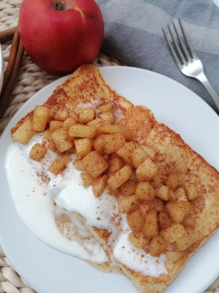Servir las tostas, por encima las manzanas caramelizadas, quedan deliciosas con un poco de yogur por encima, miel y más canela.