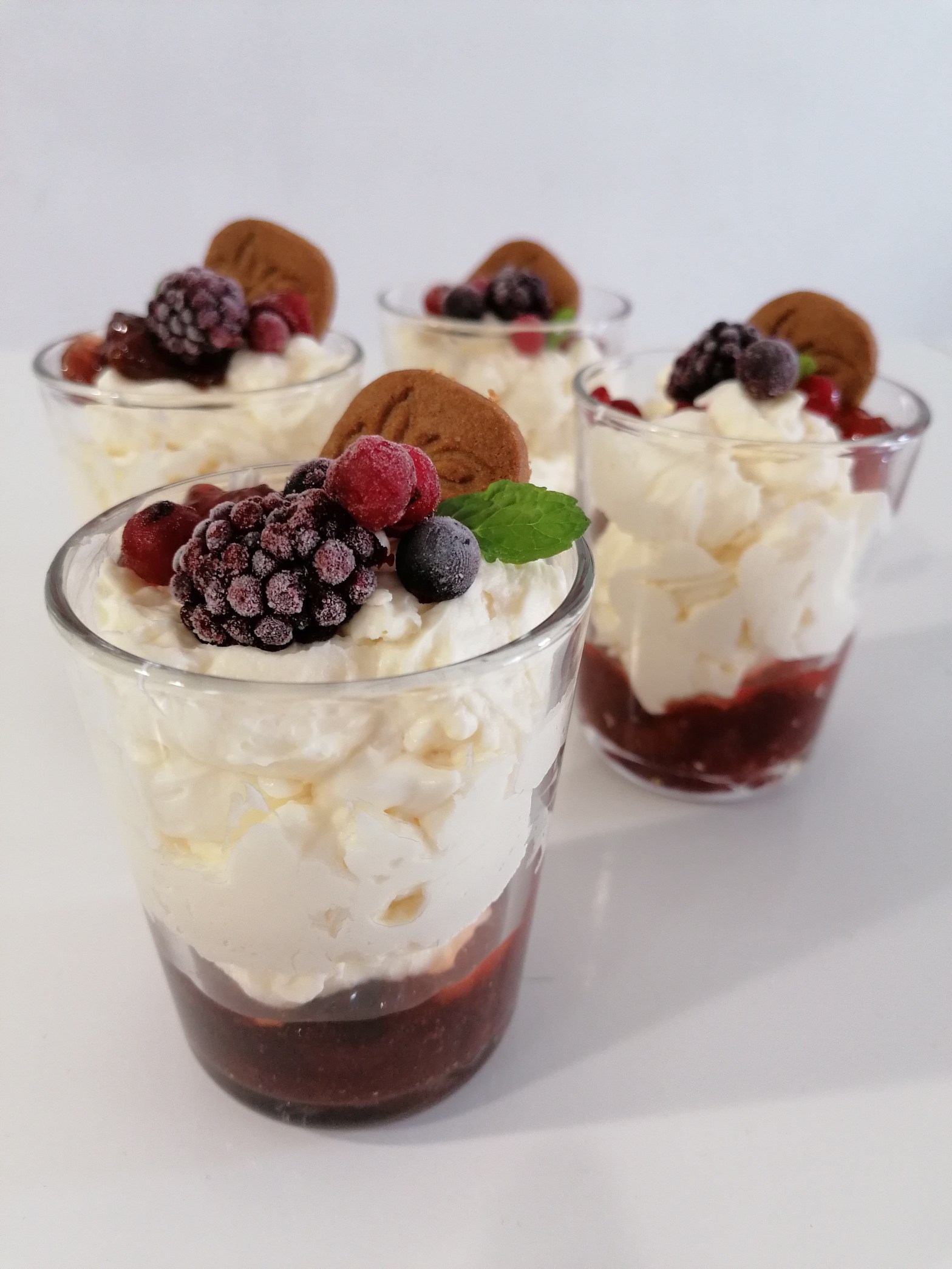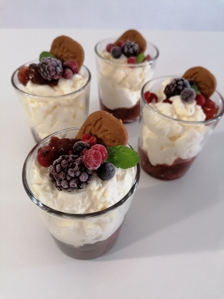 3️⃣Pillar un vasito y poner un poco de mermelada. Colocar la crema de mascarpone hasta rellenar el vaso. Y decorar con frutos rojos, en mi caso congelados) y media galleta.