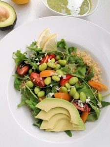 En este caso hay quinoa, rúcula, tomates cherries, aguacate, edamame (estaba en el congelador y ya había pedido cita en la oficina municipal para empadronarse en mi hogar), unas miguitas de queso azul (hice una salsa para la pasta y ahí se quedó lo que sobró olvidado en el fondo de la nevera) y el aliño con tahini, perejil y limón que les enseñé por aquí el año pasado.