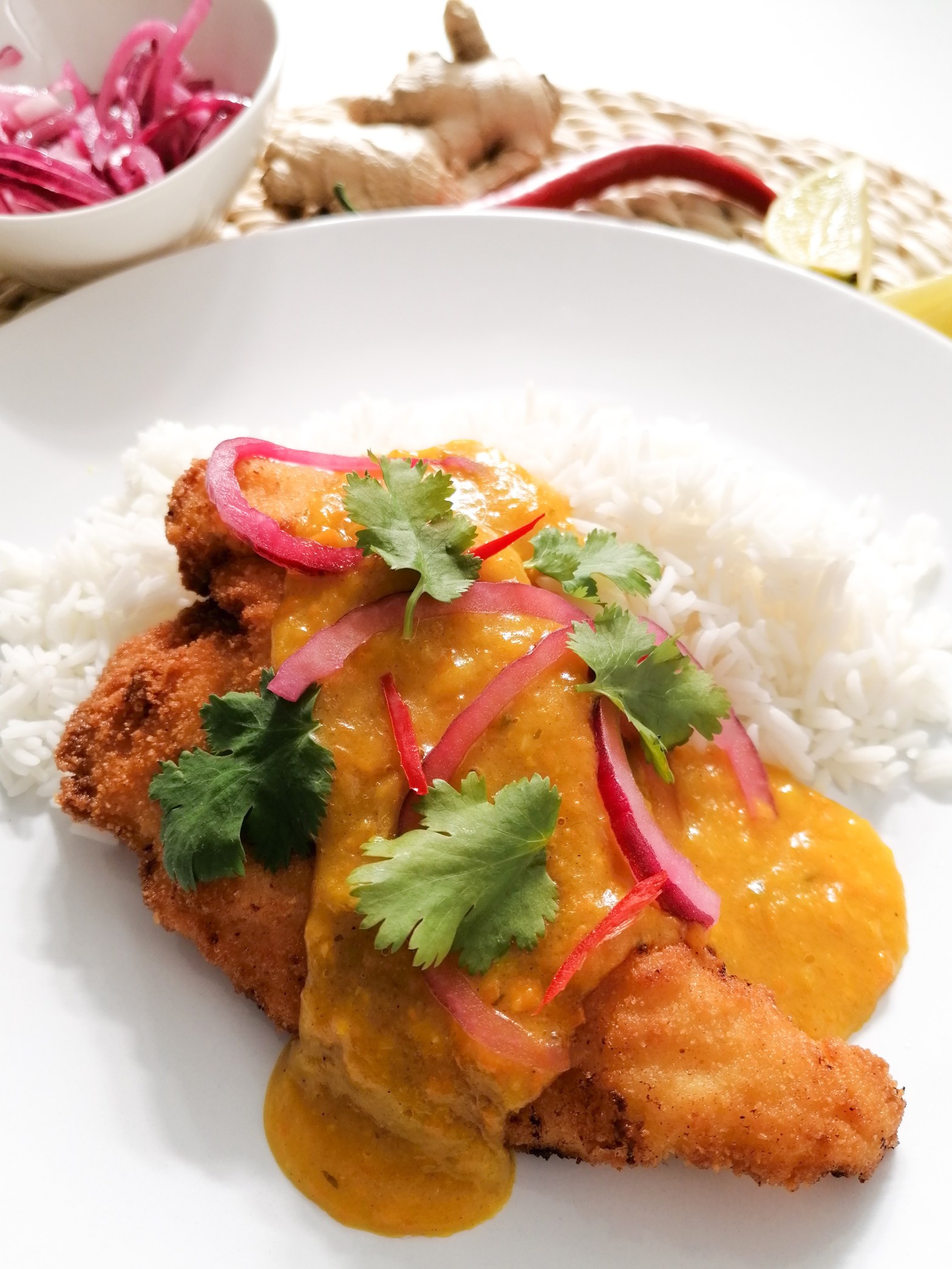 Yo quería hacer una versión de curry Katsu que vi en el libro e Jamie que él preparaba con pollo, lo que pasa es que ya saben que soy un espíritu libre y al final salió una versión de la versión de la versión.
