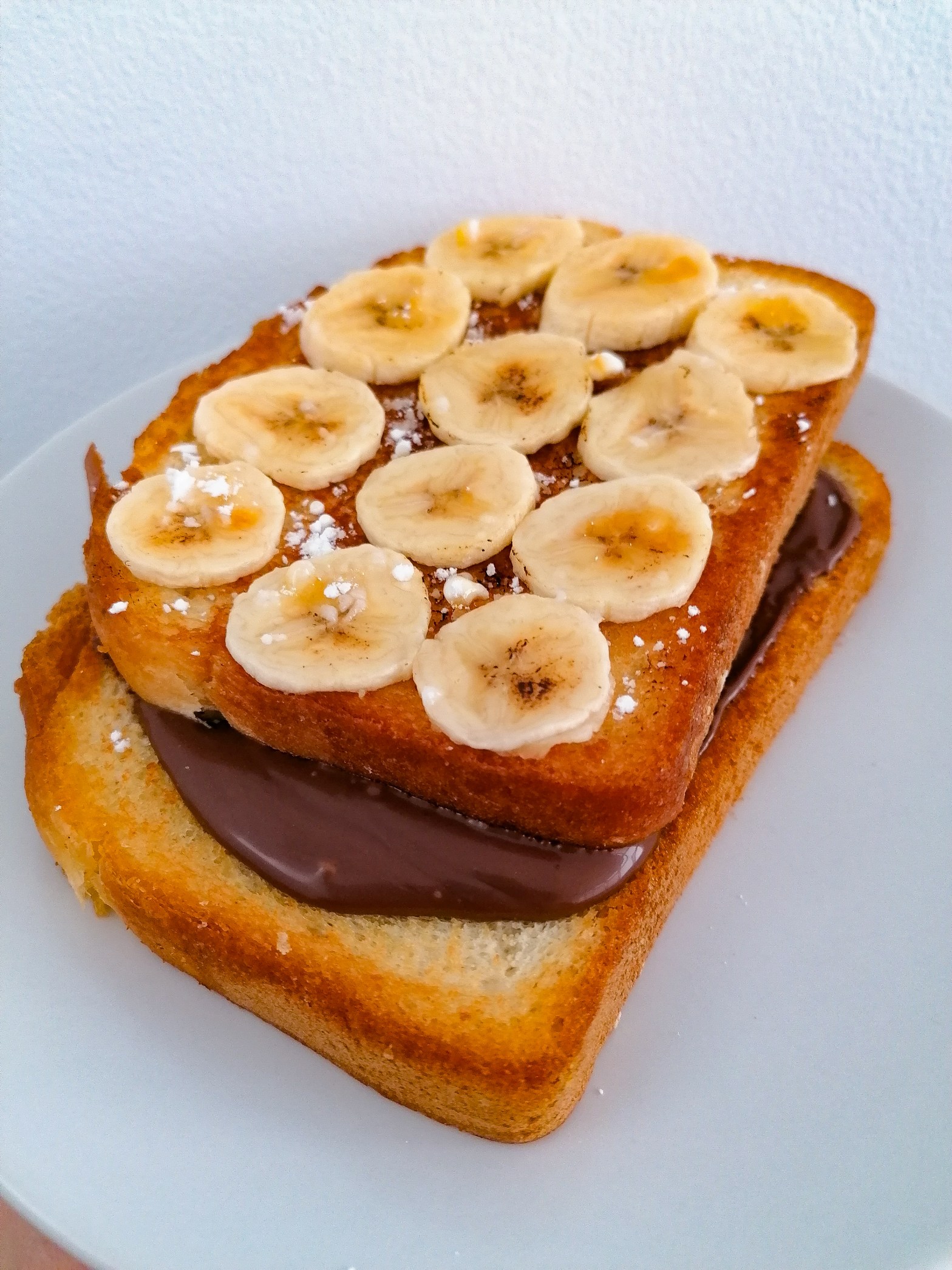 Le vi a @yeraylorenz en sus stories que había ido a un restaurante y le pusieron un pan de Brioche con mantequilla relleno de Nutella y con plátano doradito por encima y azúcar glas. Caramelicé el plátano con ayuda de un soplete de cocina pequeñito.
