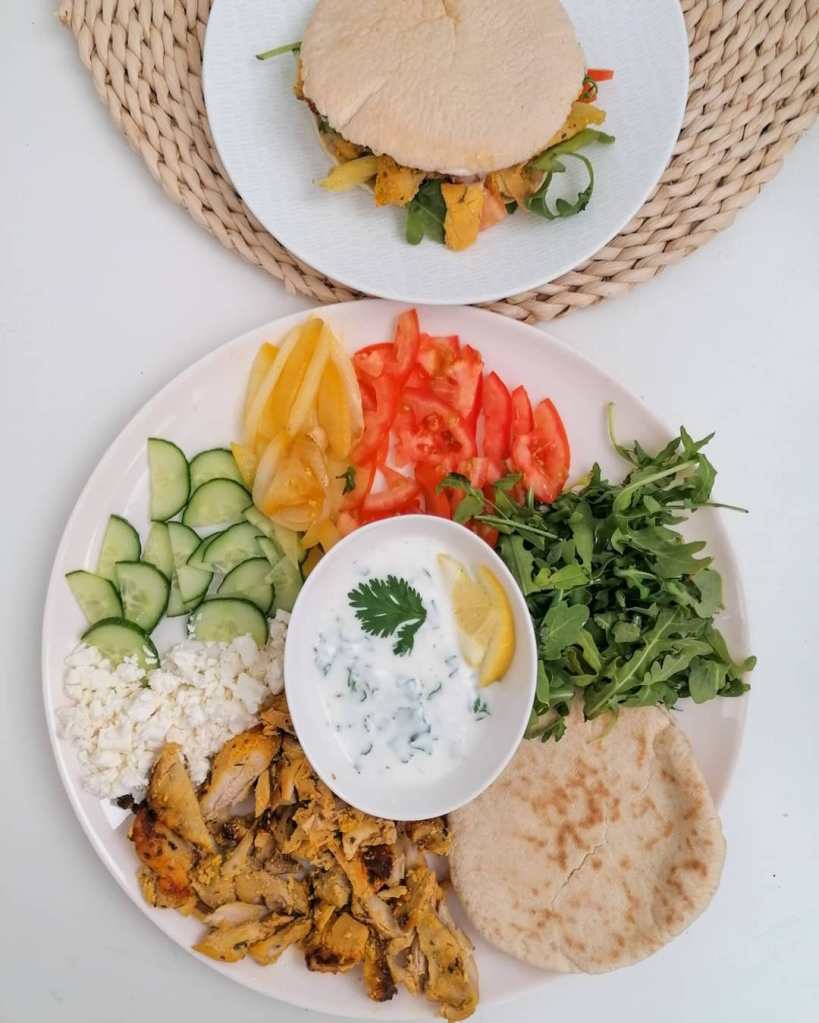 Nosotros lo acompañamos de vegetales,queso feta, pan de pita y una salsa casera de yogur, limón y más cilantro del que es legal. Me gusta el frescor de la salsa de yogur con el sabor suave y especiado del pollo.