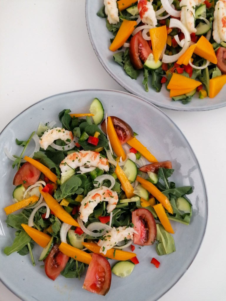 Ensalada de langostinos, mangas, tomate, pepino y rúcula.