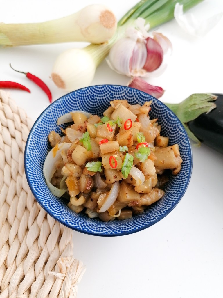 1️⃣En una sartén pon un chorrito de aceite de oliva y espera a que esté caliente, echa la berenjena, la cebolleta, el ajo (yo lo dejo entero para que de deje el aroma y el saborcito, pero así lo puedo retirar luego) y el aceite de sésamo. Saltéalo todo bien a fuego medio alto.