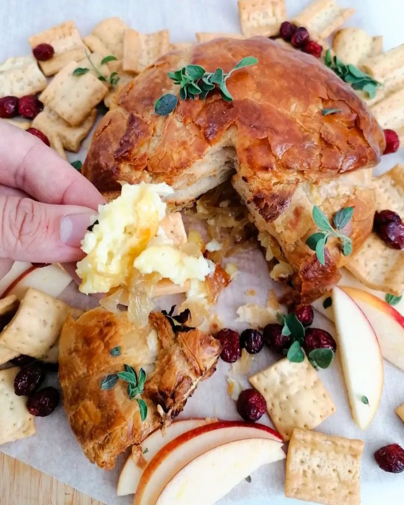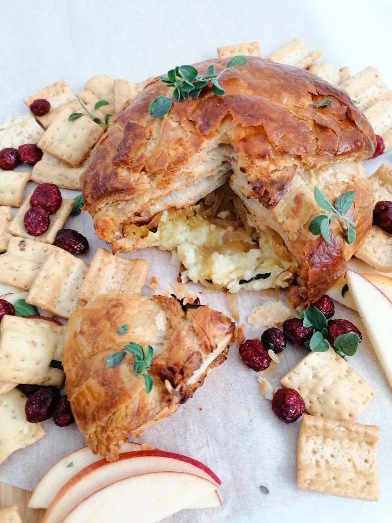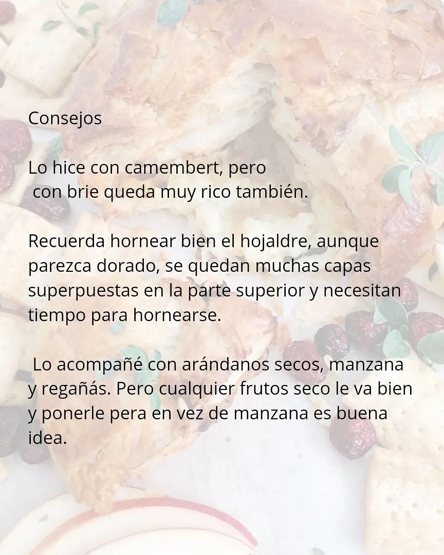Hojaldre relleno de queso camembert y cebolla bien pochada con orégano fresco .Y encima acompañado de manzana, arándanos secos y regañás.