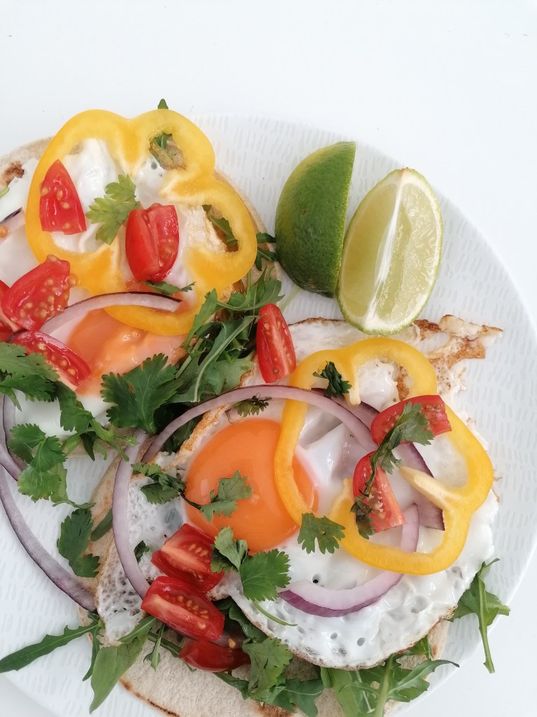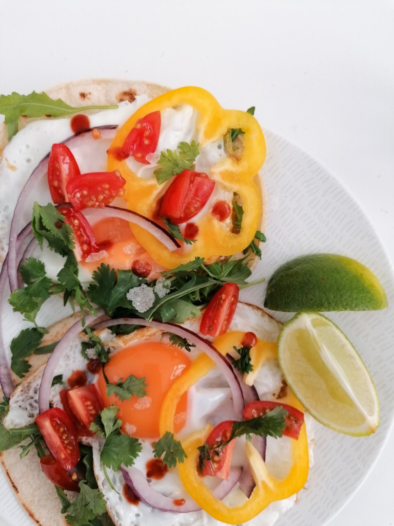 Tortillas mexicanas de las pequeñitas para tacos bien tostadas a la plancha, rúcula, huevo, pimiento amarillo, tomates cherries, cebolla roja, cilantro, unas gotas de salsa sriracha de @pepeoil_official «Pepacha» y unas escamas de sal.