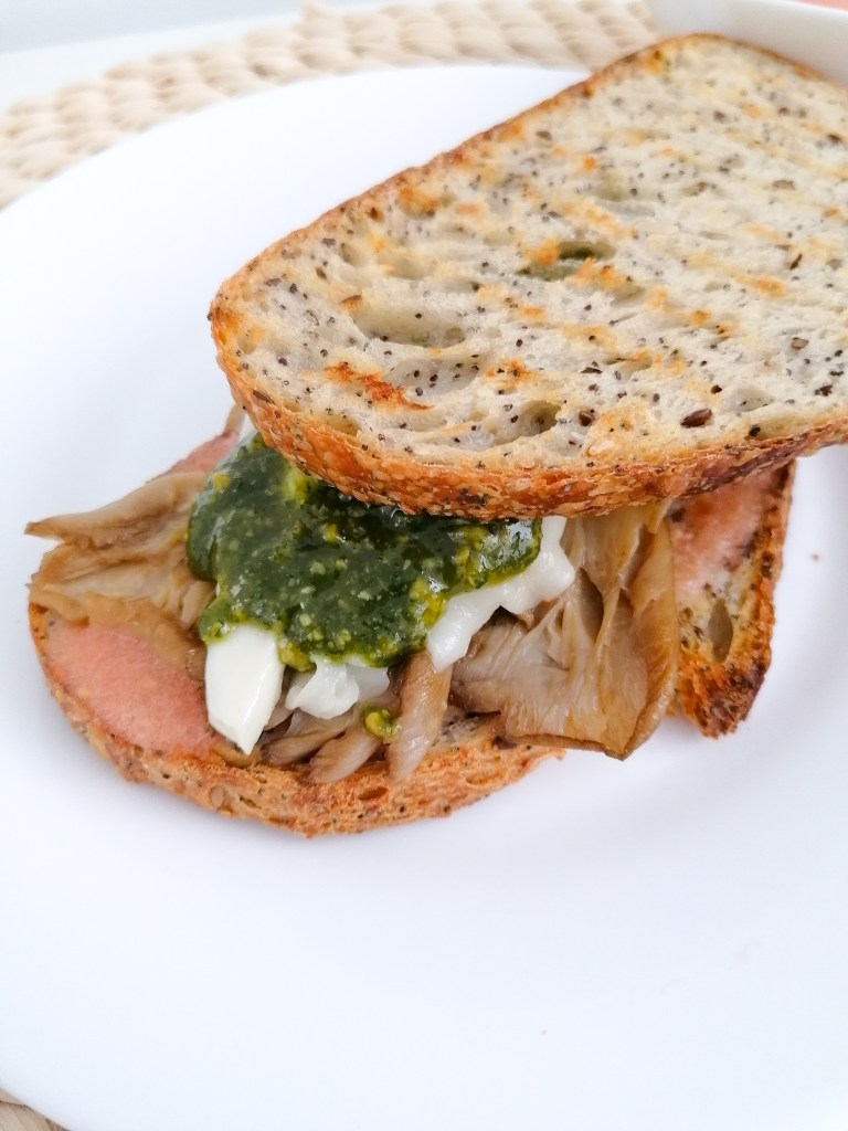 2️⃣Bocadillo con pan de @pan_alogia tostado, tomate triturado, setas a la plancha, queso ahumado de cabra a la plancha, pesto.