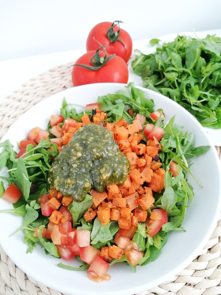 1️⃣Ensalada templada de batata amarilla asada especiada con cebolla en polvo, ajo en polvo, orégano, pimentón,queso recién rallado, sal y pimienta,tomate picado y rúcula. Prometo vídeo explicando esto como Luis Fonsi, despacito. Porque queda tan rico que merece más protagonismo.