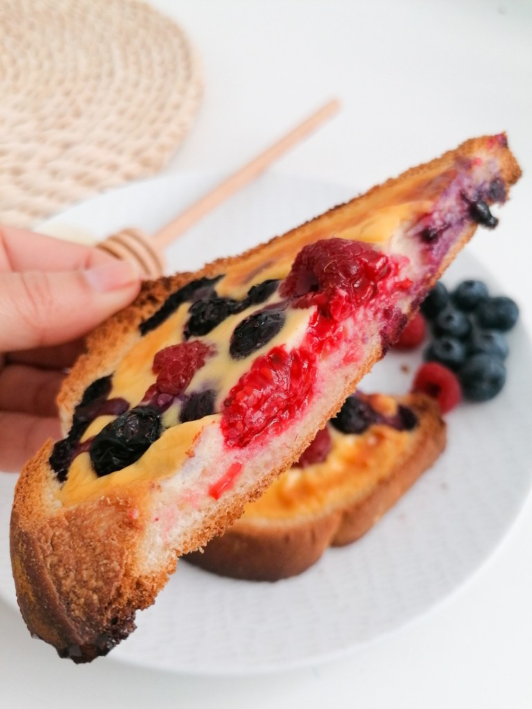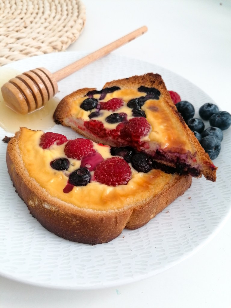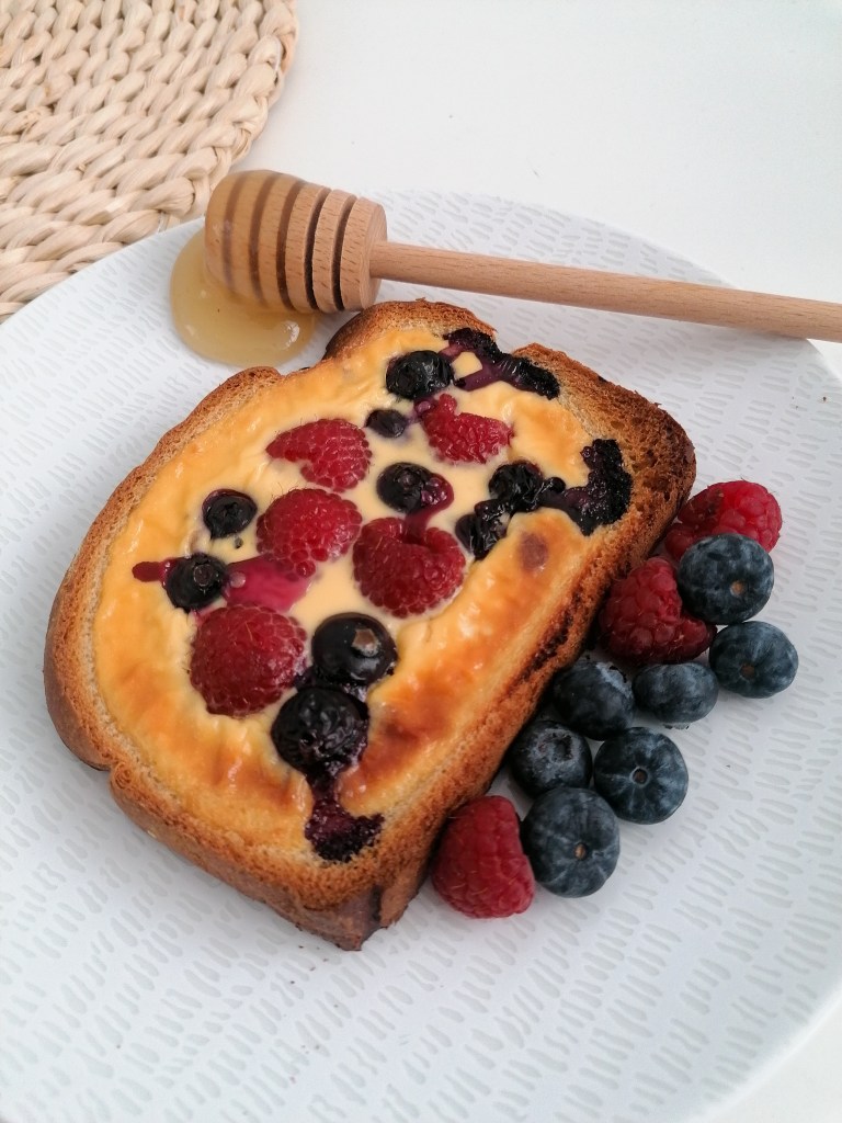Pero al ver estas tostadas me dije «Mi misma eso tiene que saber mucho a huevo». Pero me equivoqué, están ricas y ligeras. Bien crujientes y con el jugo de la fruta horneada queda jugoso.