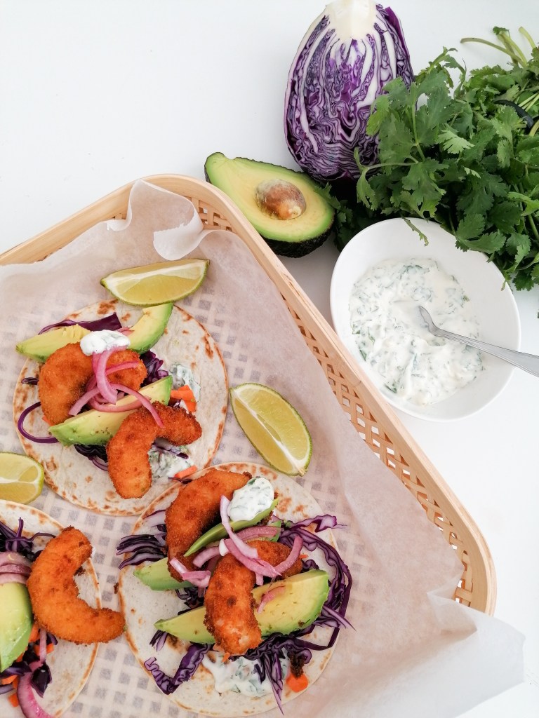 Tacos de gambas empanadas con salsa de lima y cilantro