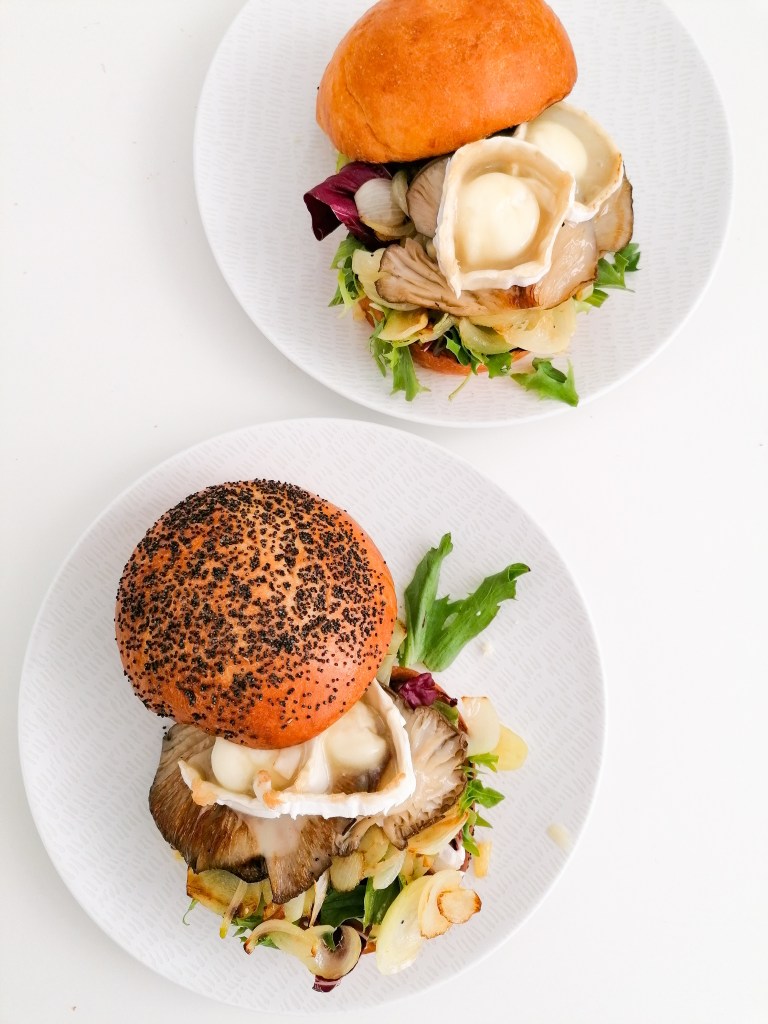 En la foto hay pan de hamburguesa de @pan_alogia relleno de mayonesa, chalotas doraditas con amor y aceite de oliva virgen extra, lechugas, setas a la plancha y queso rulo de cabra. ¡Esto sí que es para soñar!