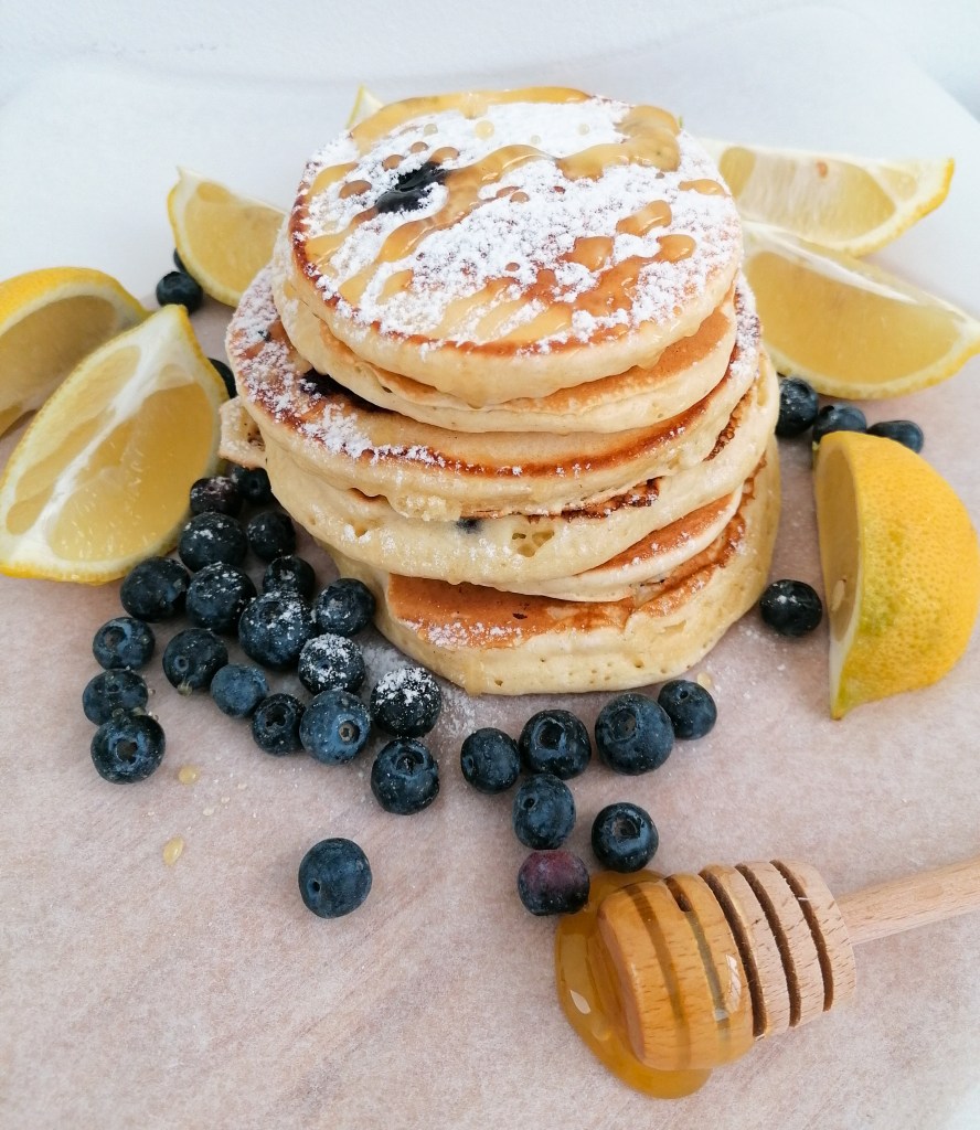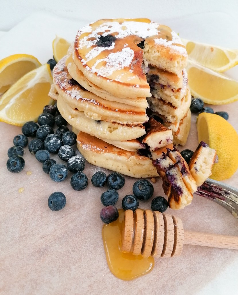 Quedan muy esponjosas, con un ligero sabor a queso, el toque cítrico del limón y el jugo de los arándanos que se derriten con el calor e inundan el interior de las tortitas.
