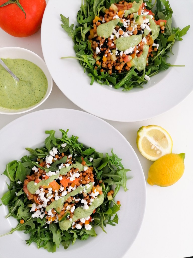 Esta ensalada de lentejas, tomate y queso feta se hace en diez minutos, sí las lentejas son de bote, no me juzgues; pero es que quedan muy ricas. El queso salado bien deshecho va genial con el frescor del pepino y los dados de tomate. Si encima le pones el aliño ver de que te nombro en la receta vas a sentir que estás de vacaciones. Sacia mucho y se digiere genial, todo lo que le pido a estas legumbres vestidas de verano.