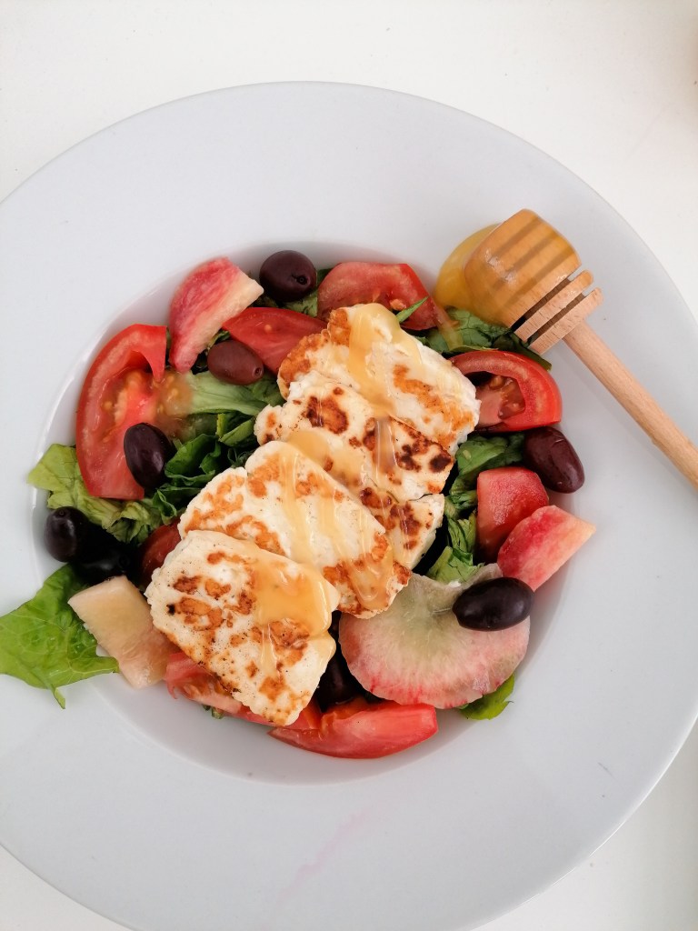 Ensalada de halloumi, melocotón, aceitunas negras y miel.