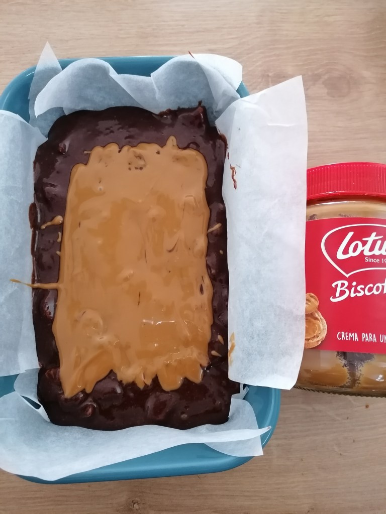 - Forra un molde con papel de hornear y pon la mitad de la mezcla. Calienta unos 8 segundos la crema de galletas Lotus en el microondas para que esté lo suficiente líquida como para poder extenderla con ayuda de una cuchara por encima de la masa del brownie, intenta que no llegue al borde.