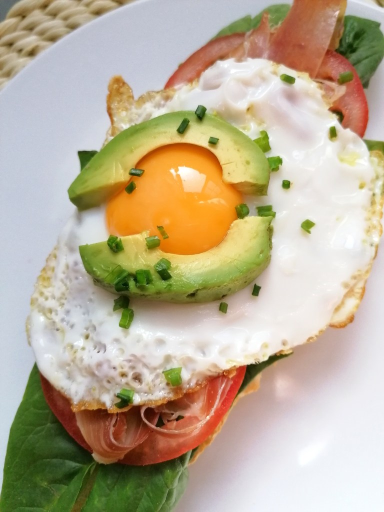 Esta fantasía es de mis favoritas, pan de Ingenio (Gran Canaria), espinacas frescas más tiernas que un bebé durmiendo, rodajas de tomate, jamón serrano, huevo a la plancha, un poco de aguacate y cebollino fresco recién picado.
