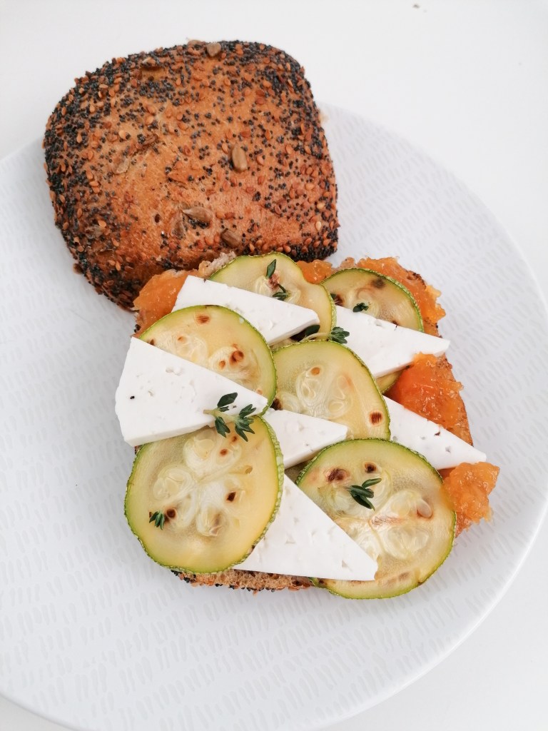 Pillé un trozo de queso de queso tierno de quesería «El Faro», pasé por la plancha unas rodajas de calabacín con un poco de aceite de oliva y le puse por encima unas hojas de tomillo fresco.