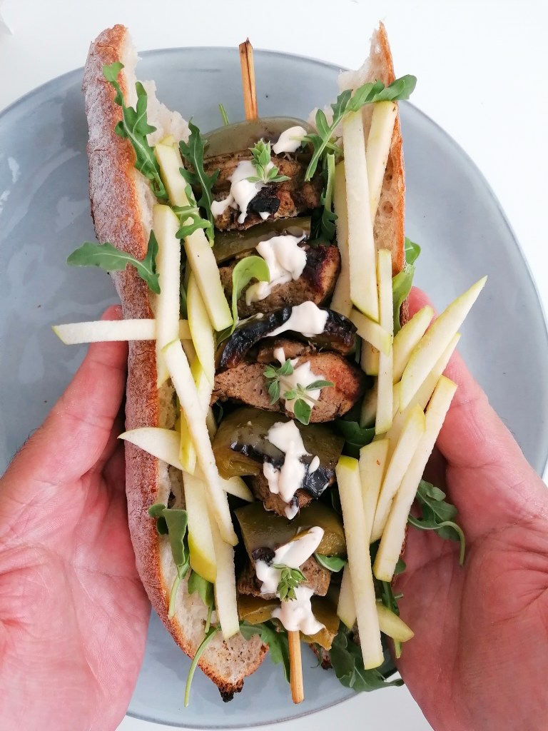 - Abre el pan, intenta que sea de la mejor calidad que puedas encontrar. Pon un poco de la mayonesa picante en una de las capas y coloca encima la rúcula, luego las tiras de manzana verde y por último el pinchito. ¡NO SEAS ANIMALITO Y QUÍTALE EL PALITO ANTES DE ZAMPÁRTELO! Si te apetece le puedes poner un poco más de mayonesa picante.