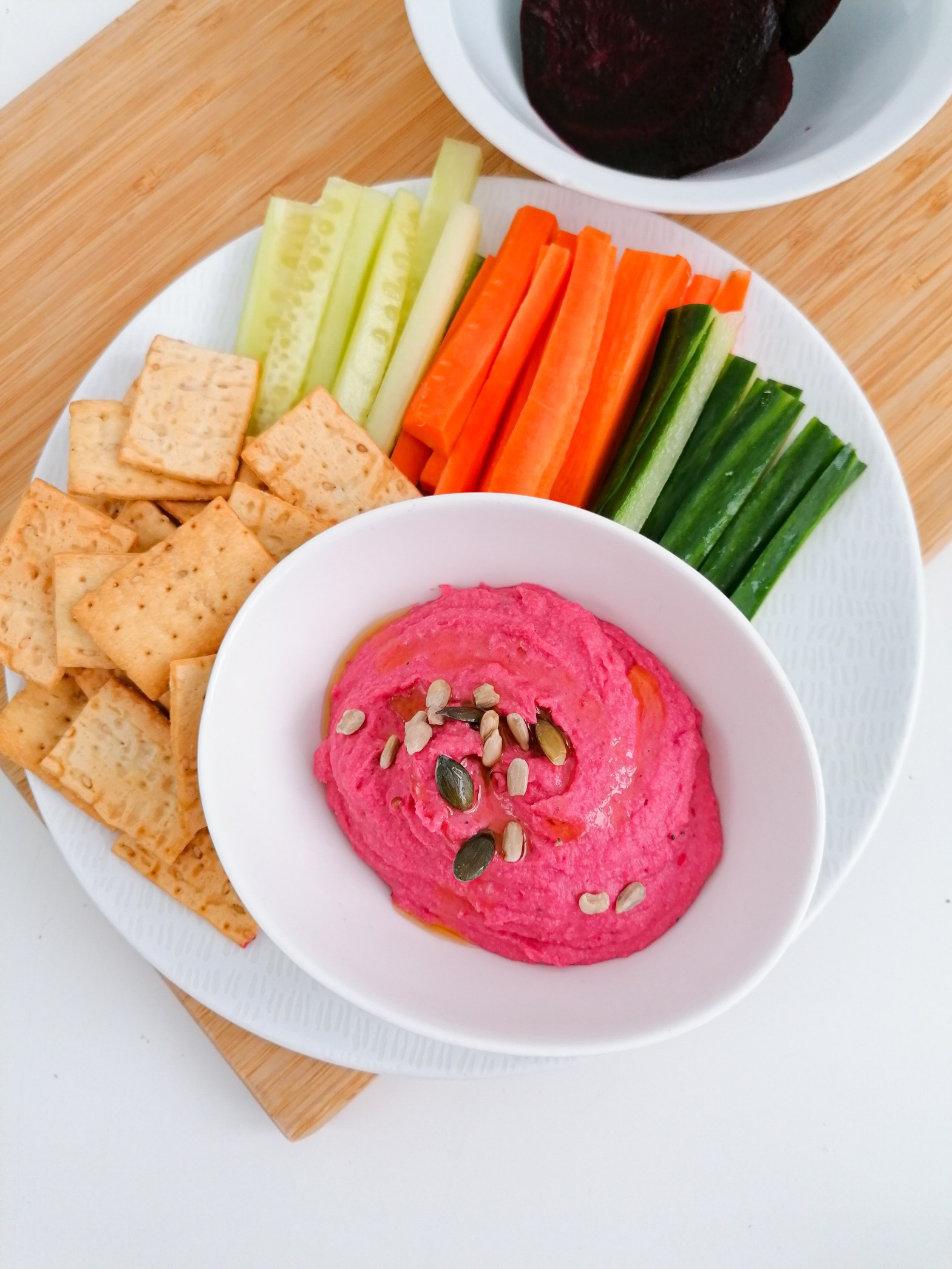 Confieso que empecé a hacer este hummus solo, porque adoraba el color rosa que tomaba. Se veía tan lindo en la mesa. Siempre que tenía un evento preparaba trío de hummus;el clásico, el de tomate seco y este de remolacha.