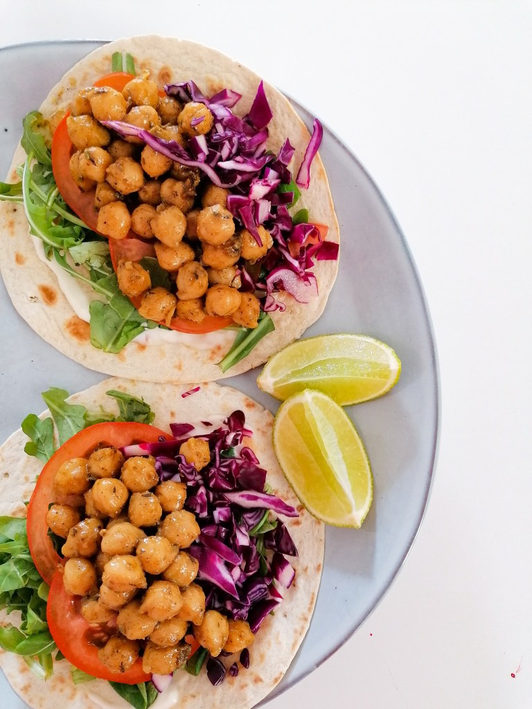 Estos tacos rellenos de garbanzos salteados con especias cajún son una de las recetas que le pasé. Sabrosos, se comen con la mano, puedes dejarlos preparados con días de antelación y montar el taco justo antes de comer. Y encima quedan precioso.