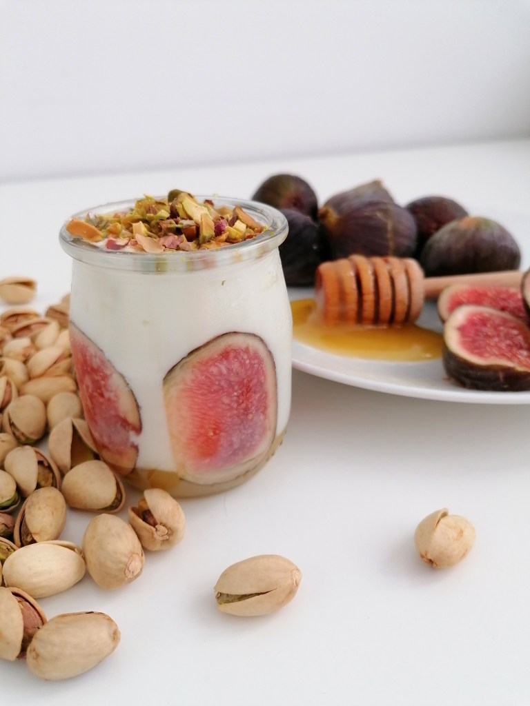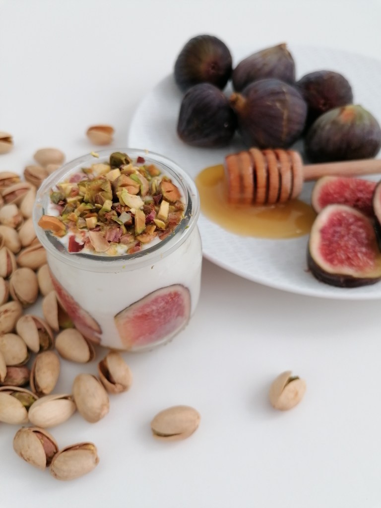 Higos, yogur griego, miel y pistachos.