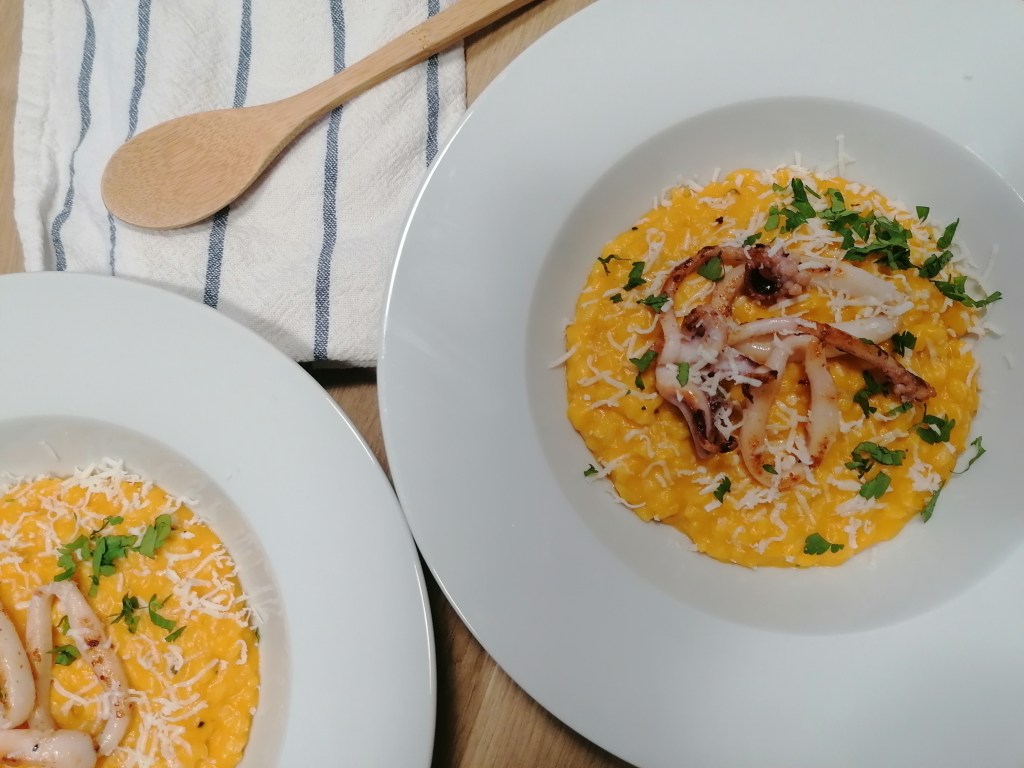 Mi adorado risotto de calabaza con calamares ¡Qué rico queda! Si tienes chipirones hazlos con ellos, queda todavía más rico este arroz.