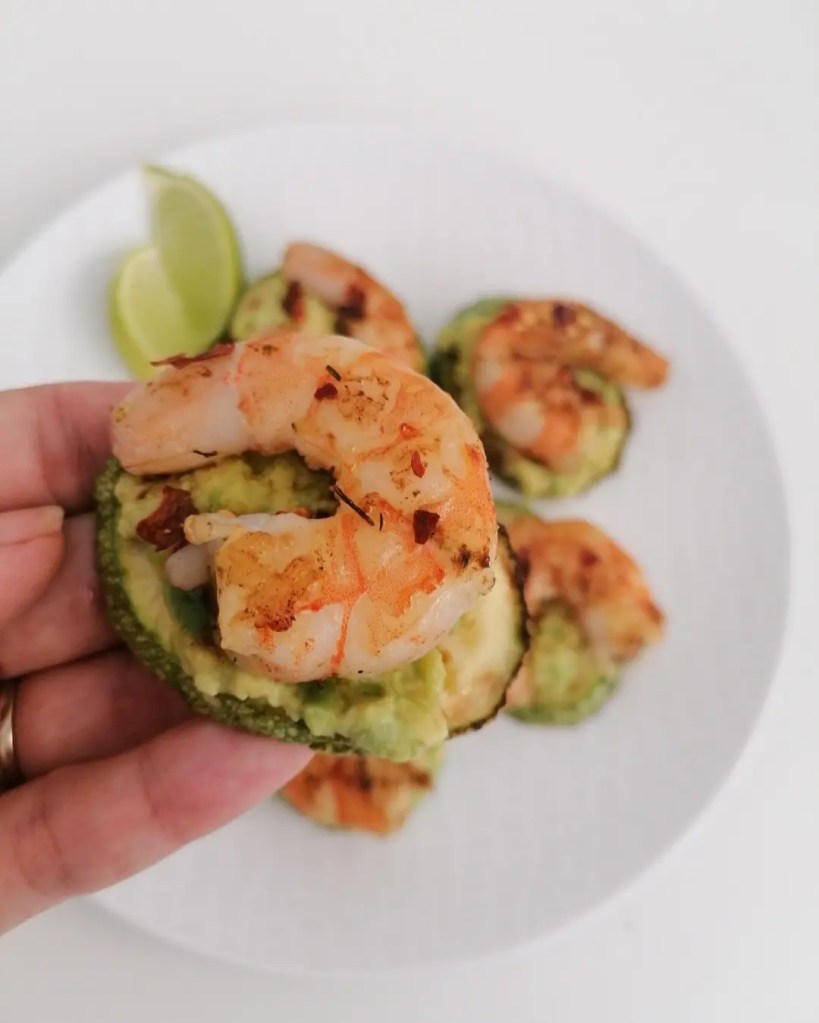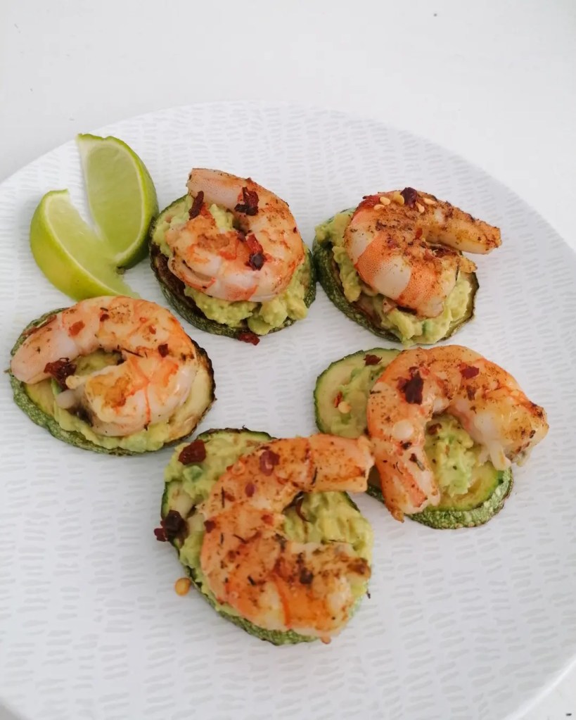 🍽️Pon la rodaja de calabacín a la plancha en el plato, encima el aguacate machado y la cima la gamba. Si te gusta el picante tanto como a mí ponle copos de chili. Si em cambio no lo soportas, te aconsejo que piques muy pequeñito un poquito de tomate seco conservado en aceite y se lo pongo por encima a este bocadito. ¡GLORIA PURA!
