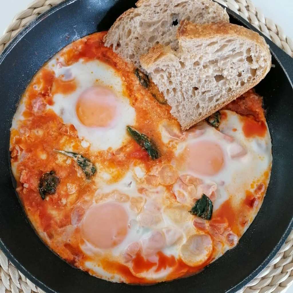 Se llama así, porque la salsa de tomate parece el fuego del infierno y los huevos flotando en ella las almas del purgatorio. Yo les puse burrata, porque tenía una espectacular en la nevera. Pero puedes omitirla o cambiarla por otro queso. El pan sí que es imprescindible.