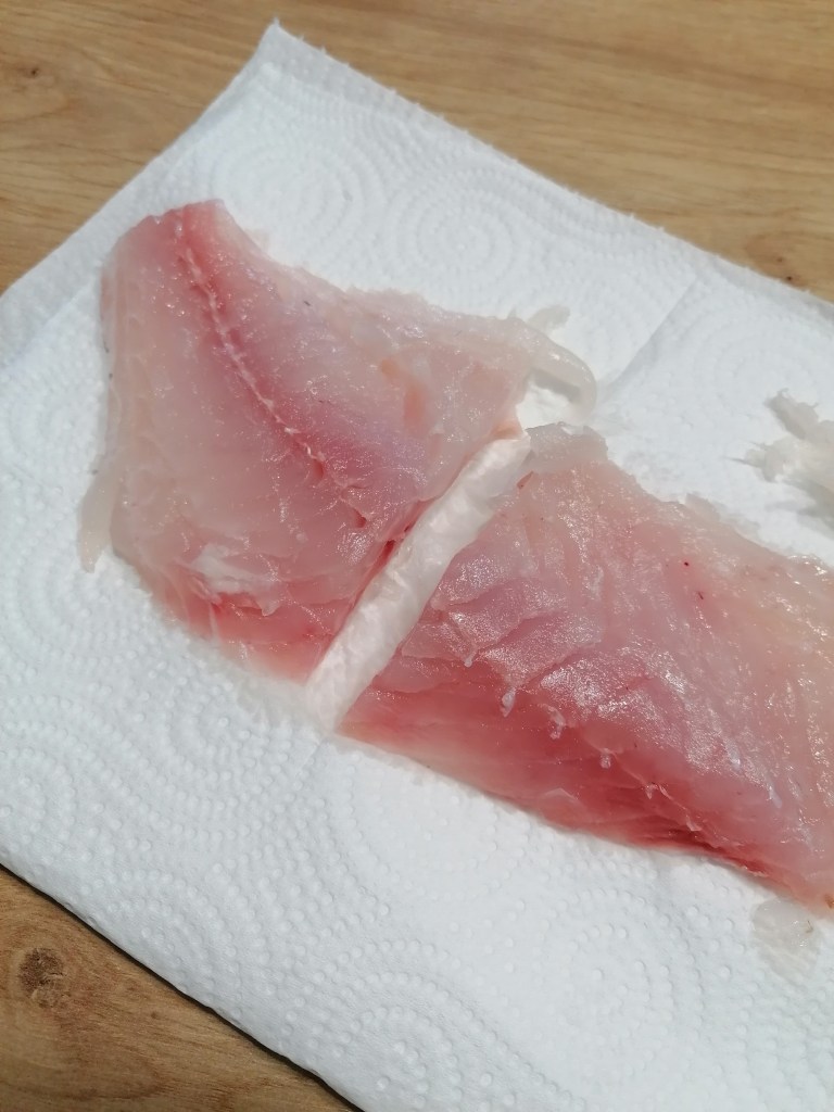 1. Espolvorea el pescado con un poco de sal y déjalos reposar en la nevera con appel film al menos 20 minutos. Si puedes 1 hora, pues mejor. No pasa nada si te saltas este paso. Pero yo te estoy contando los trucos para que te quede extra crujiente.