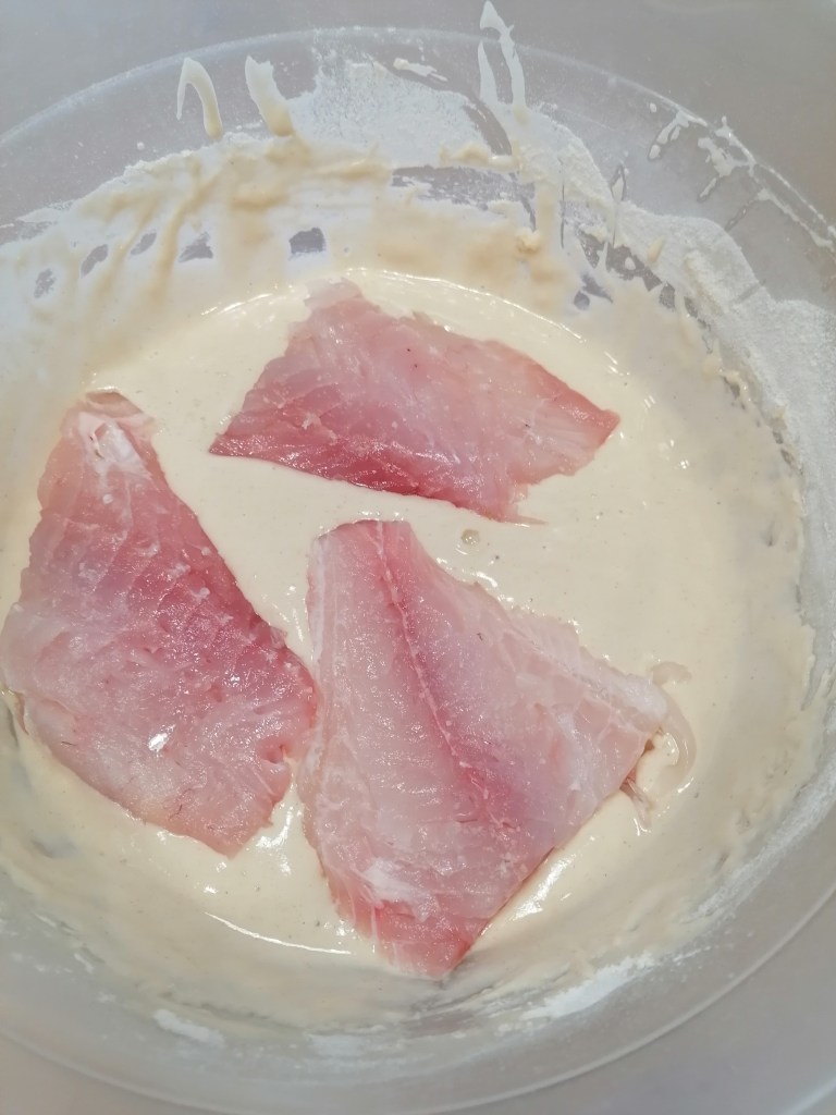 3.Saca los filetes de pescado, sécalos muy bien con papel de cocina y asegúrate de que no tienen ni una espina.Introduce el pescado en el bowl de la mezcla y asegúrate de que se quede bien recubierto por la masa.