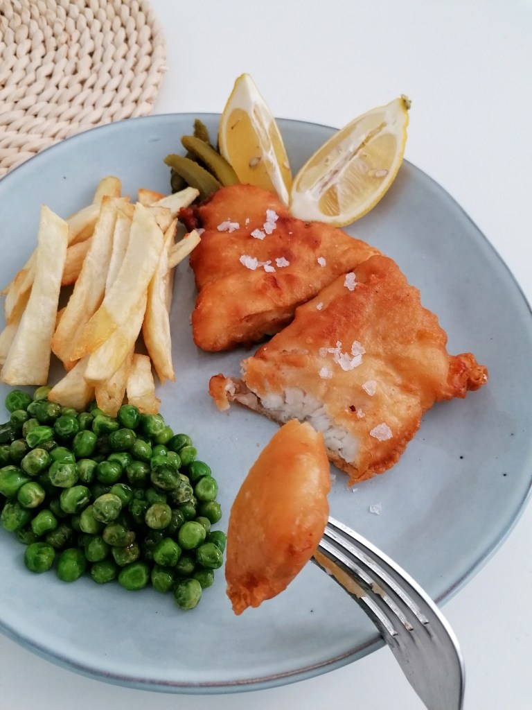 5.Yo lo sirvo siempre con papas fritas y guisantes salteados. Ya lo de añadirle vinagre a las papas o no depende de como de British te sientas ese día.