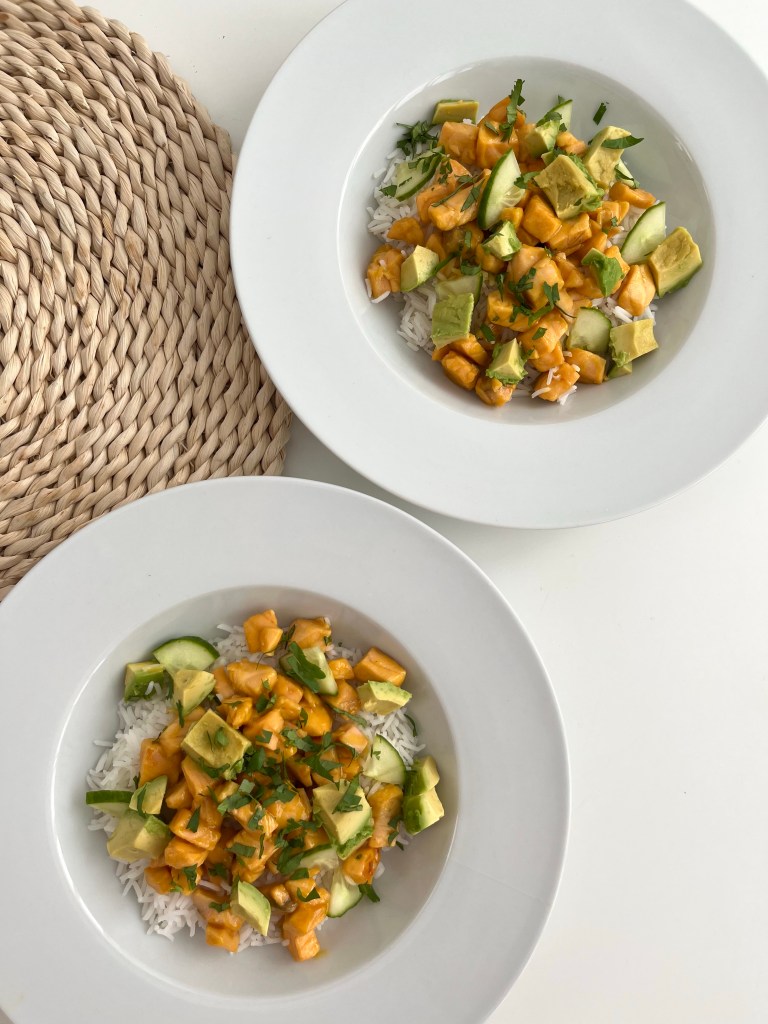 4. Yo lo acompañé de arroz basmati,aguacate,pepino y cilantro,pero tú ponle lo que te apetezca.