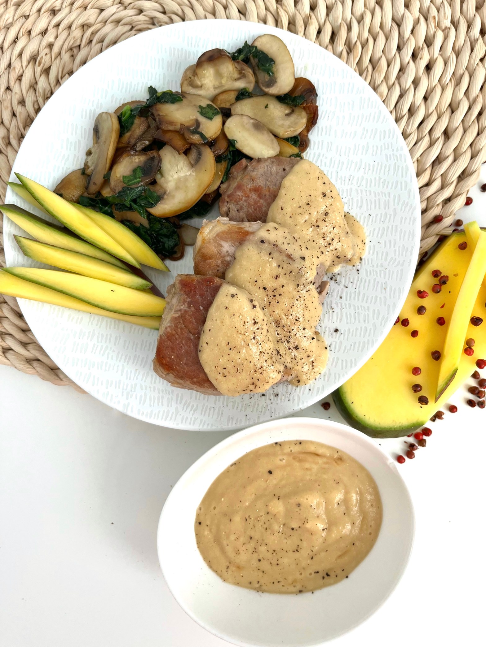 Yo le añado más pimienta negra recién molida por encima y lo acompaño el salteado de champis y espinacas y unos trozos de manga en tiras.