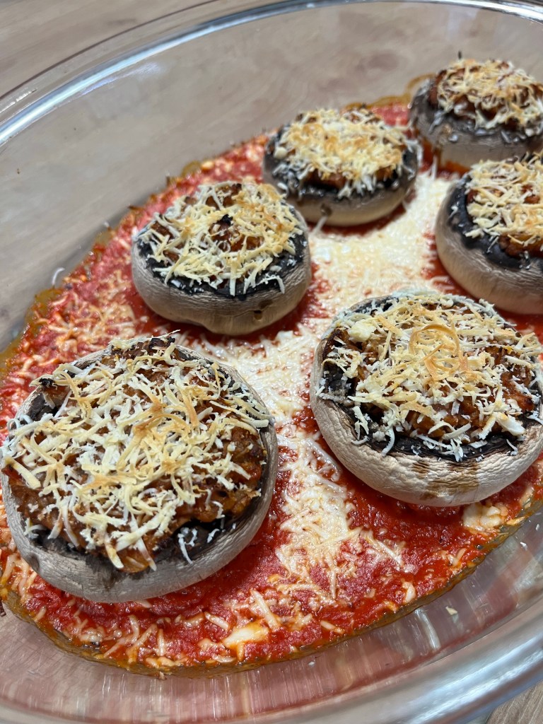 5. En una fuente apta para horno,pon esta salsa. Encima coloca los champiñones rellenos con la mezcla de atún que tenías al fuego.