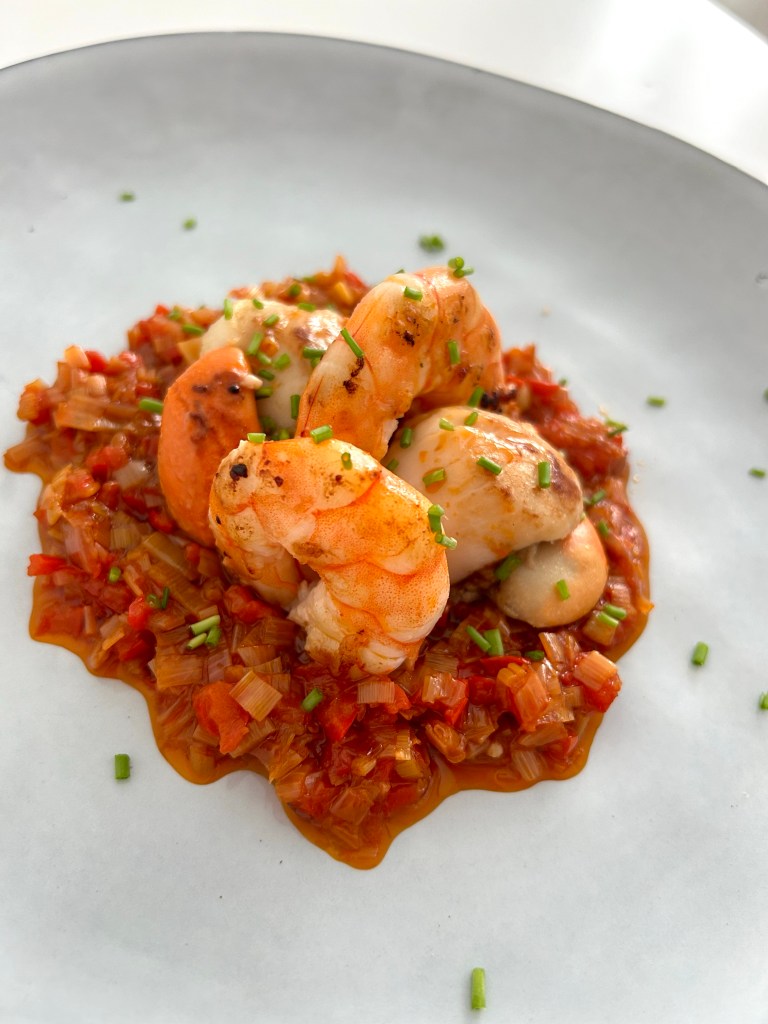 6. Pon encima del sofrito las vieiras y sobre las vieras las gambas. Asegúrate que aprovechas bien el aceite sobrante del sofrito y ponle unas gotas por encima. Corta cebollino fresco y espolvorea un poco por encima. ¡A disfrutar!