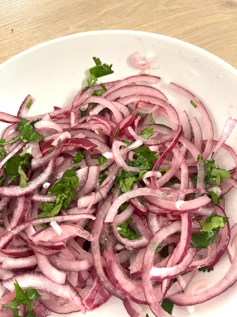 2. Mientras,corta la cebolla en juliana y mézclala con el resto de ingredientes,recuerda picar el cilantro antes de ponerlo. Métela en un tarro de cristal y déjala en la nevera hasta el final. Está más rica si la haces la noche anterior.