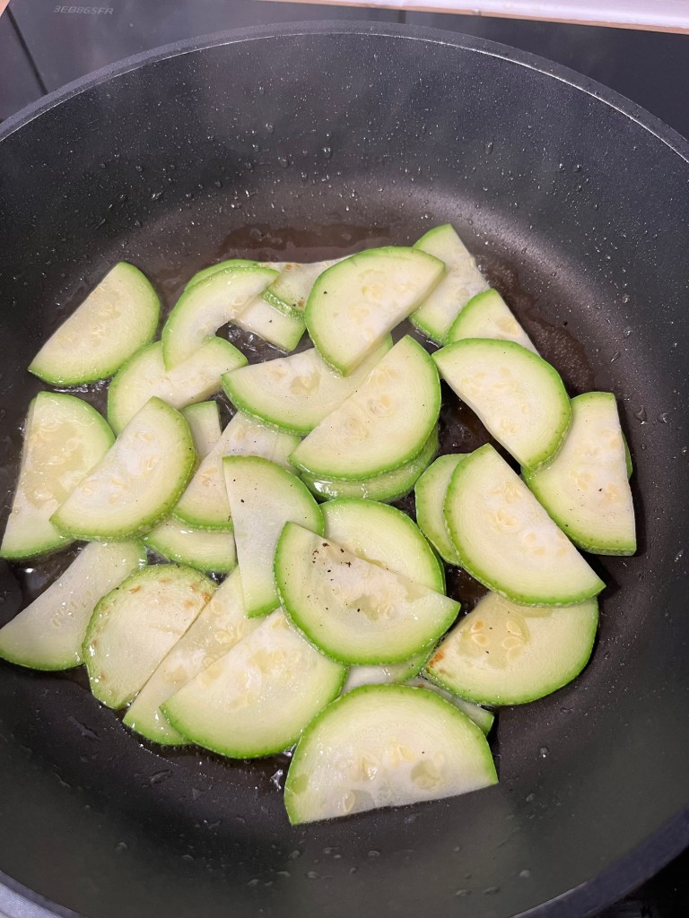 1. Corta el calabacín en cuartos y haz láminas finas. Sofríelos con un poco de aceite de oliva en una sartén.