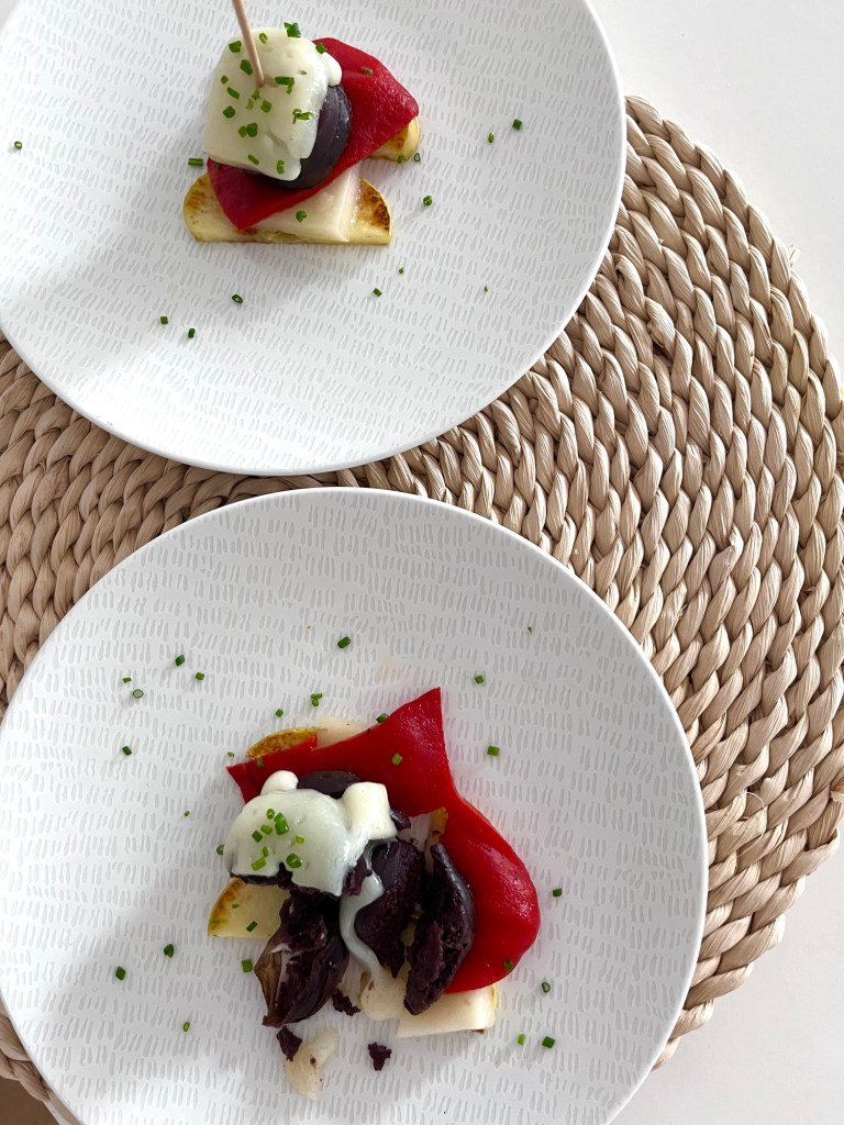 Aperitivo de morcilla dulce,manzana y pimiento del piquillo.