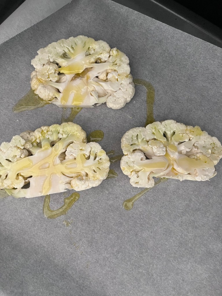 1. Corta la coliflor en rebanadas gruesas, como si fueran filetes anchos. Ponla sobre una bandeja de horno forrada con papel de horno,para evitar tener que limpiar mucho luego, echa 1 cucharada de aceite de oliva por encima. Deja que se haga en el horno a 180 grados hasta que al pincharla notes que esté blandita y el exterior esté dorado.