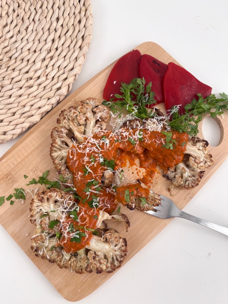 4. Saca la coliflor del horno, puedes calentar la salsa de los pimientos o ponerla fría. Ya eso depende de tus gustos. Te aconsejo que le ralles un poquito de tu queso favorito por encima; yo usé uno de cabra de esta islita,Gran Canaria.