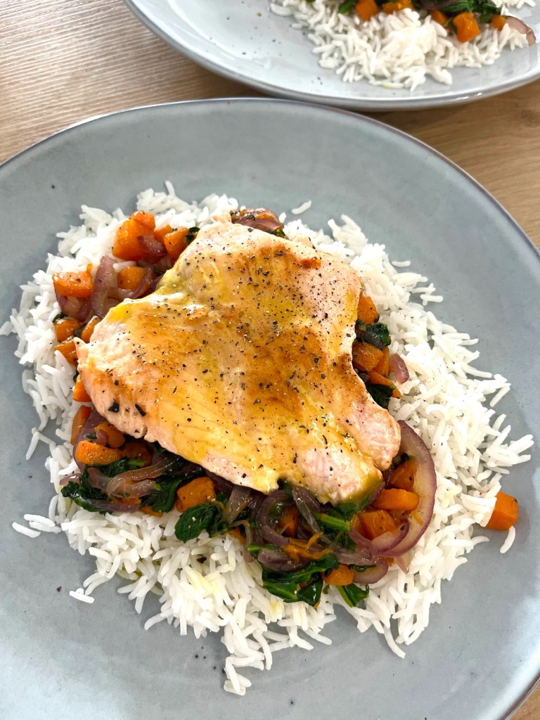 Este salmón de mostaza y miel acompañado de unas verduras divinas te salvará la semana.